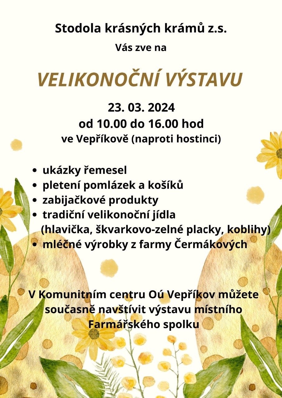 rádi bychom Vás pozvali na Velikonoční výstavu v naší Stodole krásných krámů Vepříkov, která se koná 23.03.2024 (sobota) od 10.00 hod do 16.00 hod.